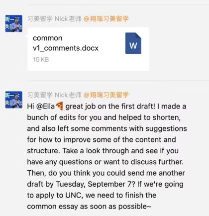很感谢我的文书老师Nick对我主文书的帮助!他并不是那种直接告诉你怎么去写或者让你直接自己先写的老师,而是在每次写作之前进行一个meeting然后倾听你的故事再给出文书框架的建议,也可能会提供一些新的思路。有时候我对文书没有想法的时候,也会通过提问题来引导我去回忆。对于主文书我和他前前后后一起改了四五稿而当产生分歧时他也会多角度的帮我分析到底如何写更好,也很尊重我的想法。